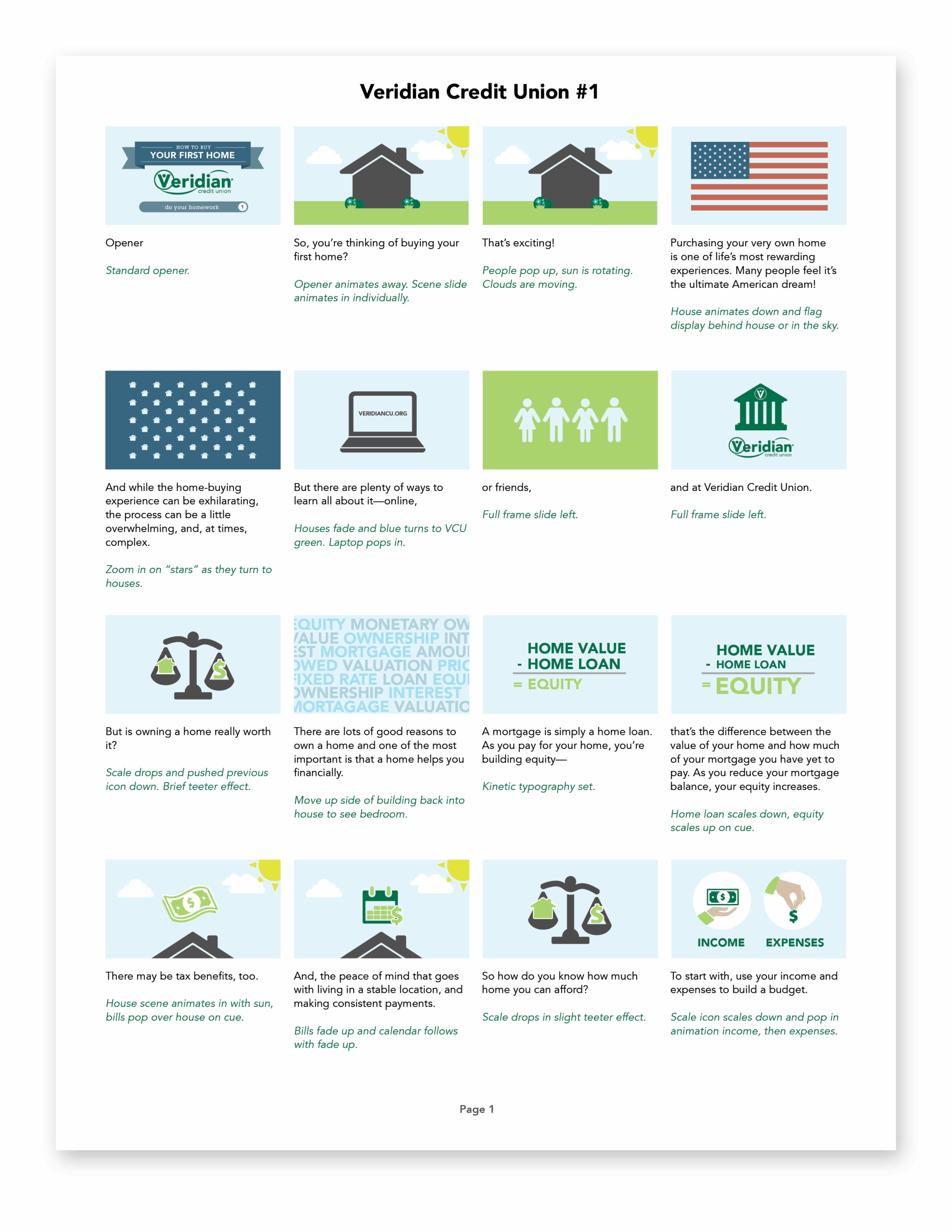For this campaign with Veridian Credit Union, I utilized a comprehensive workflow connecting Adobe Illustrator and After Effects. The project required a specific flat-color style and kinetic typography to accompany provided voice-over scripts. My process began with hand-sketching storyboards to map out the animation timing, followed by a collaborative revision phase with the Mittera video team. After creating high-fidelity vector assets in Illustrator and securing client approval, I managed the final compositing and animation in After Effects, ensuring precise synchronization between the motion and the audio narratives.