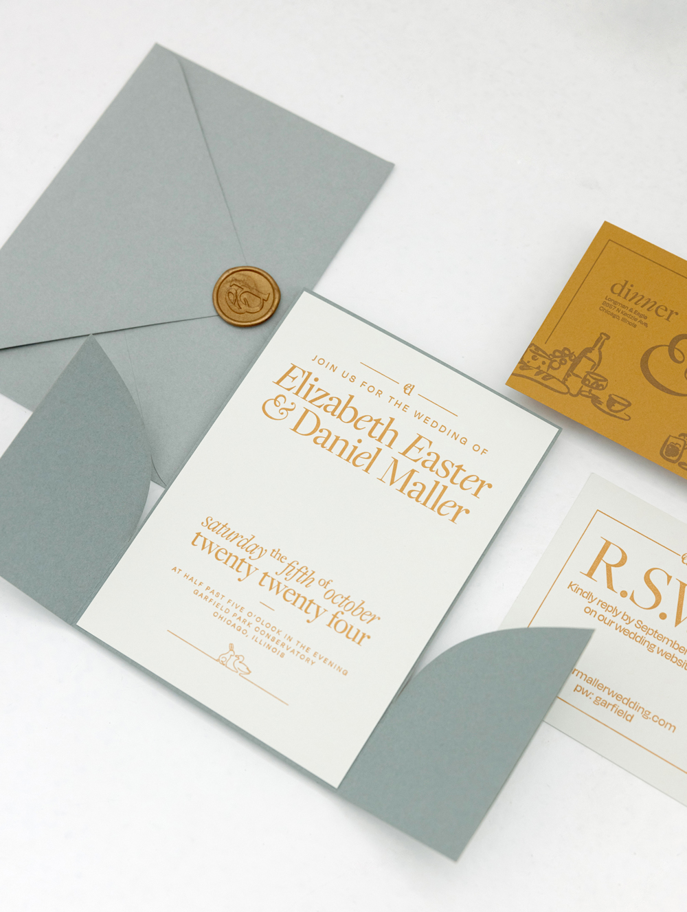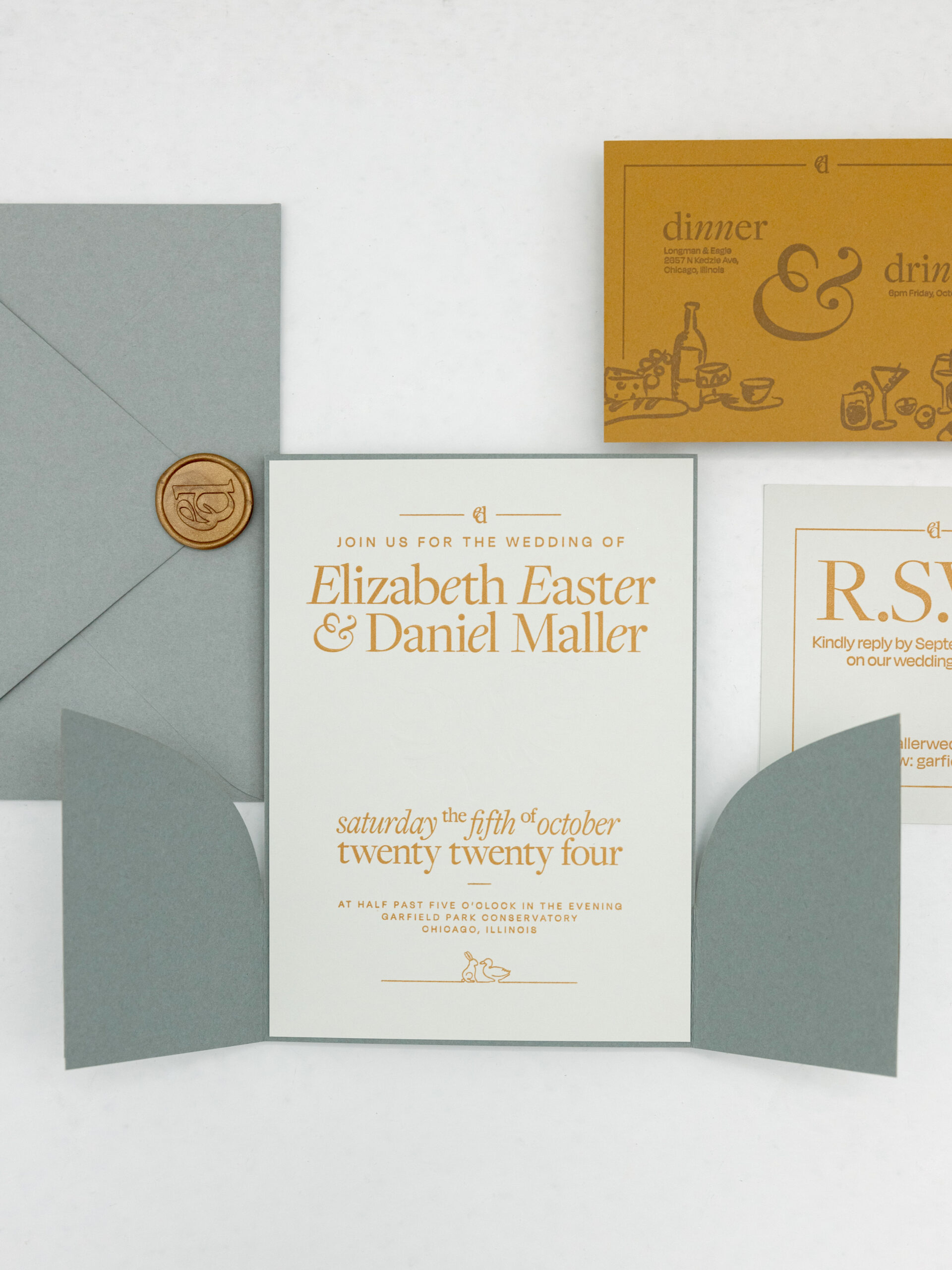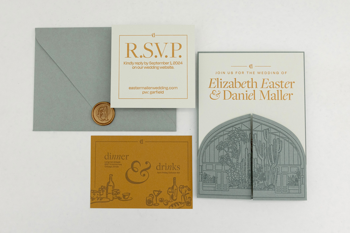 A collaborative branding project and stationery suite that bridges traditional craftsmanship with modern design. In partnership with Too Much Press, I designed a comprehensive identity system featuring a custom initial monogram and symbolic illustrations (a rabbit and mallard duck) representing our family names. The project utilized a hybrid production approach, blending letterpress on heavy-weight French Paper Co. stock with digital printing, custom wax seals, and laser-cut vinyl applications for large-scale wedding signage.